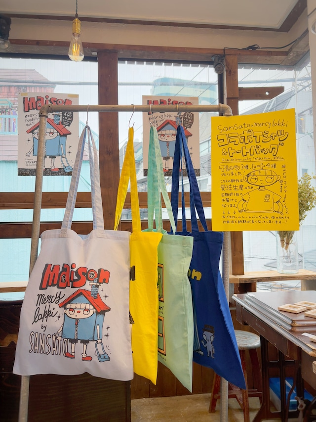 2026年春開催のmercy lokki作品展「Maison」の三叉灯とのコラボグッズよりトートバッグ イラスト集『Maison』からデザインしたトートバッグができました 今回は両面にデザインがあり、作品展「Maison」ロゴとイラスト集に登場するキャラクター4種のデザインです。ビビットカラーのトートバッグが春のわくわくを感じさせてくれます。 【仕様】 日常づかいとしてはもちろん、幅広いシーンに使えるトートバッグ。厚手のアウターの上からも肩掛けができる、長めの持ち手が使いやすさの秘訣。ざっくりとした風合いの薄めの平織生地を採用し、こなれた印象に仕上げました。メインバッグとしてはもちろん、小さくたたんでもかさばらないので、持ち歩き用のエコバッグとしても活躍。 【サイズ】 本 体:約42cm×約37cm(縦×横) 持ち手:約68cm 内容量:約5L 【素材】 綿100% 【納期】 今回は受注生産のため、会期終了後の納品となります。さらに黄色のトートバッグ「ロッキちゃん」は在庫の関係でほかよりさらに納品が遅れてしまいます。 ご注文頂きました商品は一枚、一枚自社にてプリント致しますので、納品までお時間を頂いております。ご了承のほどよろしくお願い致します。