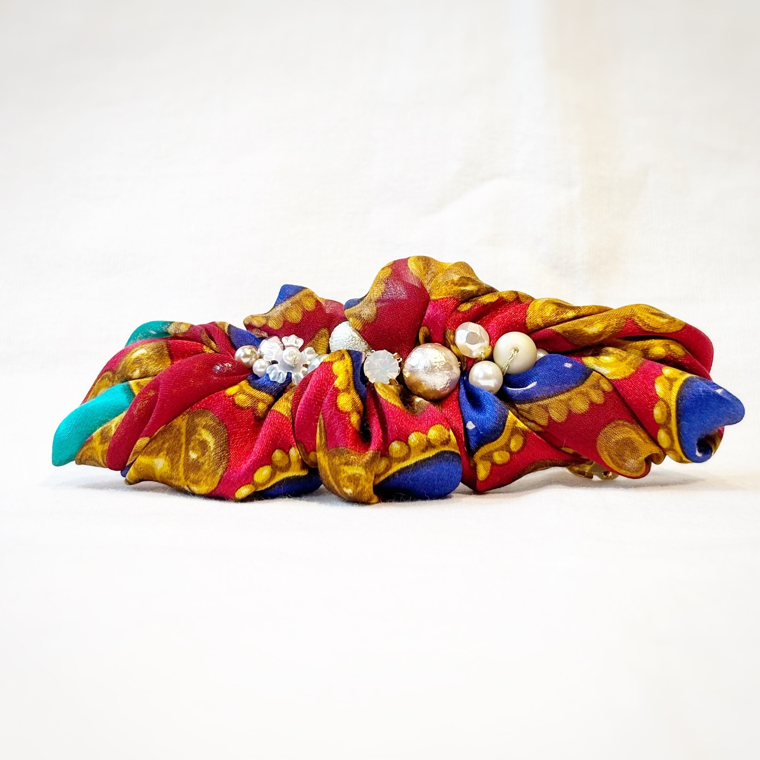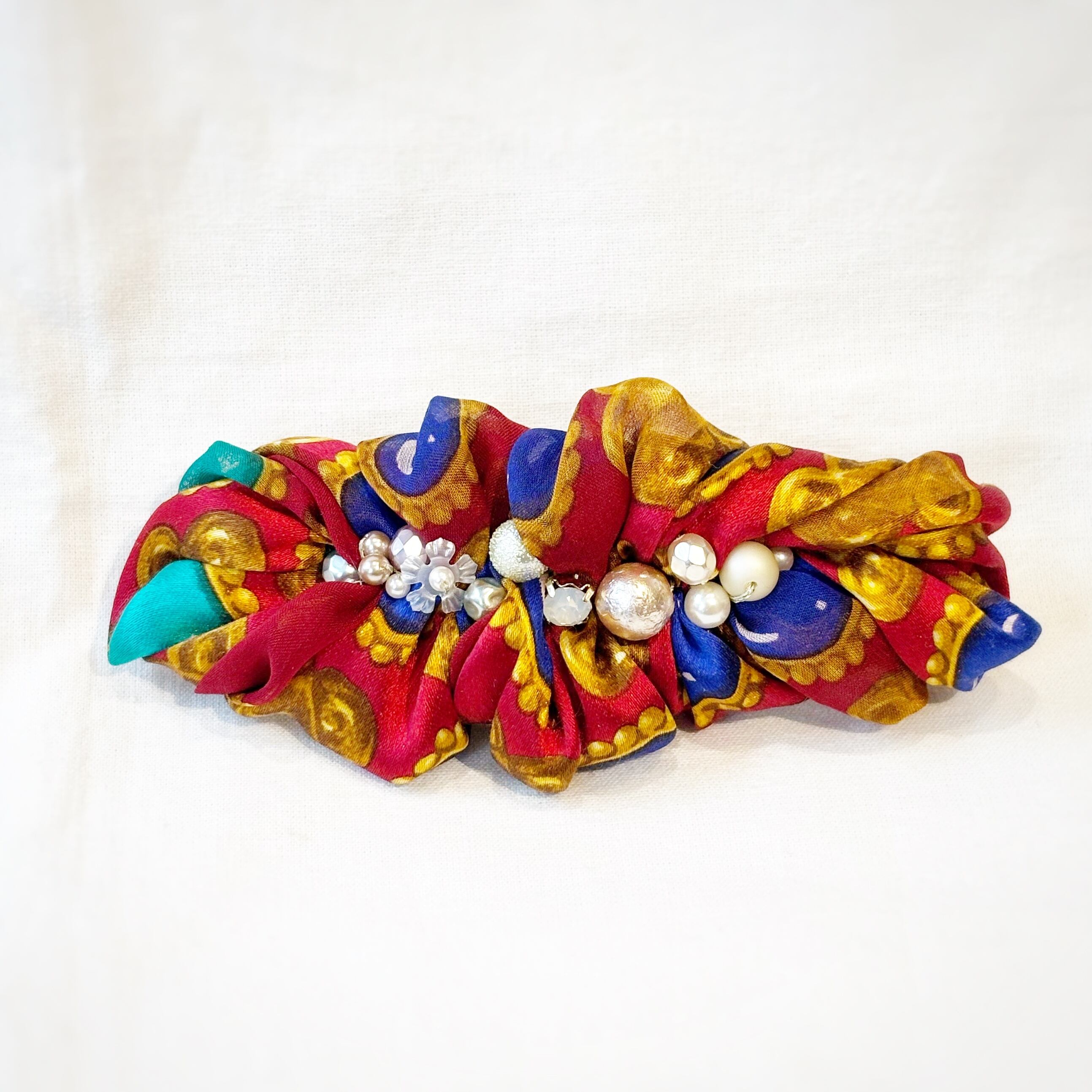 ターキーレッドのような深い赤を基調としたリボンのエレガントさに宝石のようなビーズのアクセントがきき、クラシックながらモダンに仕上がっています。