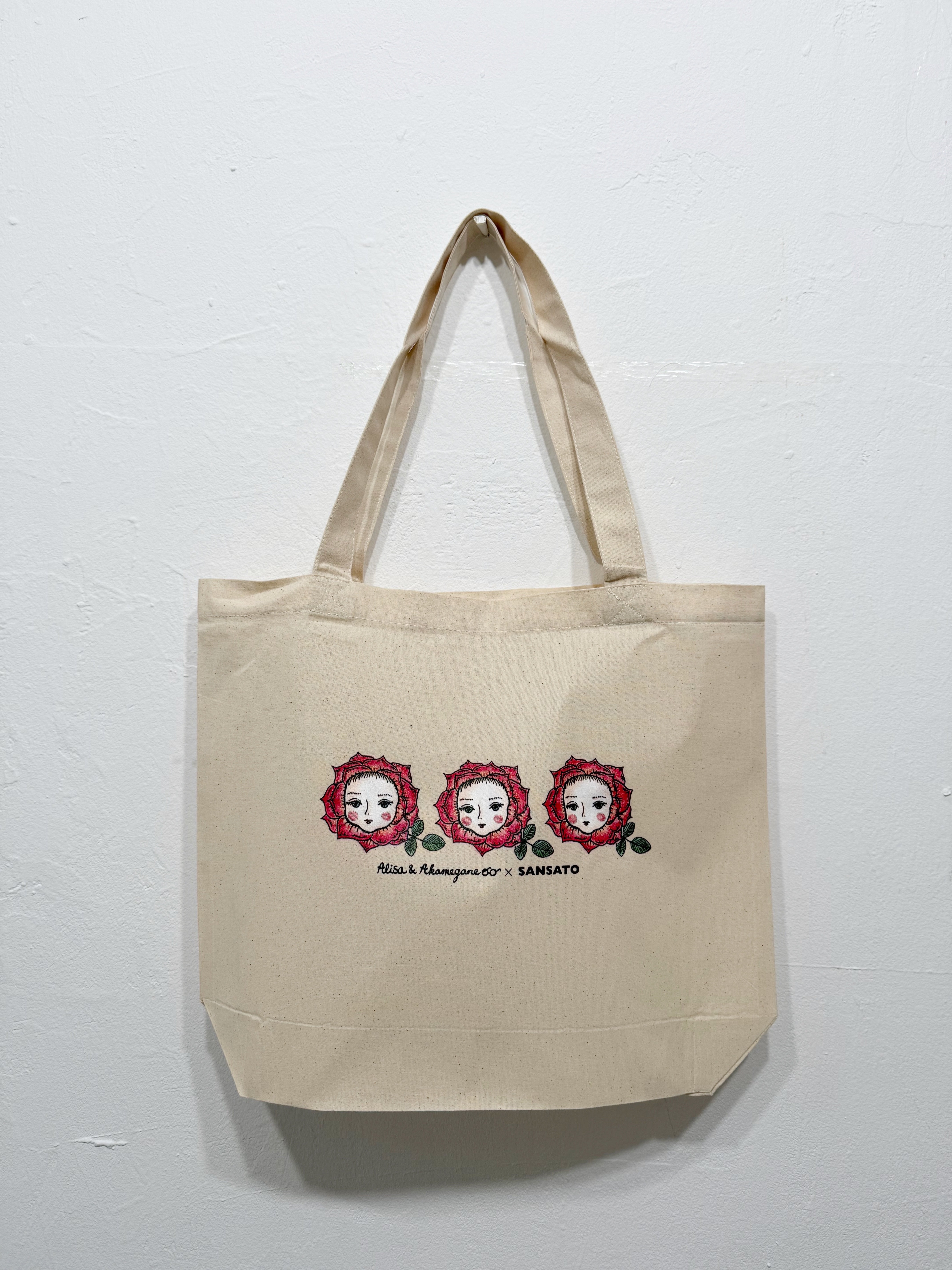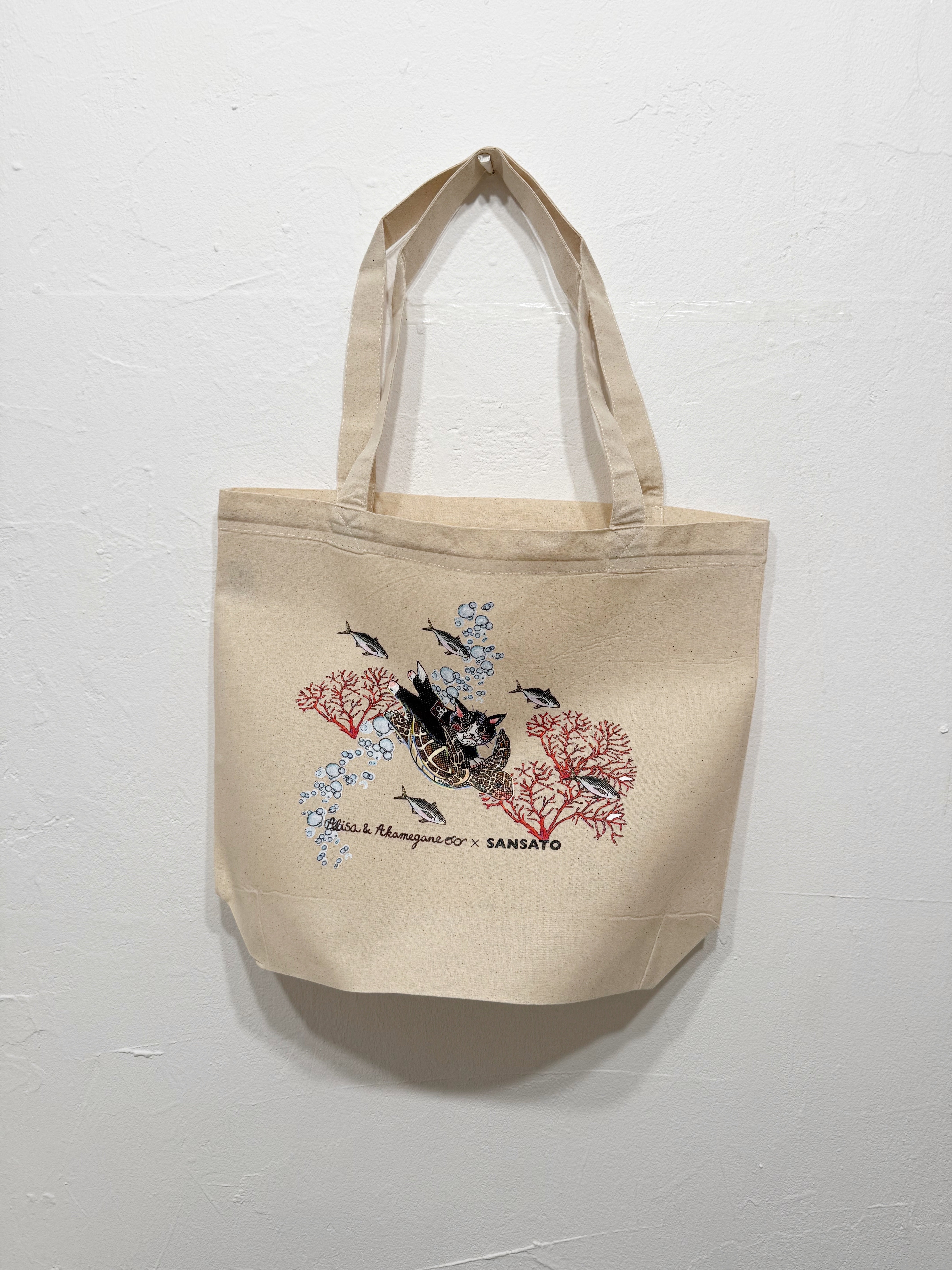 過去に三叉灯で開催したありさ&あかめがね個展時に描き下ろしたデザインを復刻させながらも、ASHAさんのトートバッグにプリントすることで本百貨店出店オリジナルのコラボグッズができました