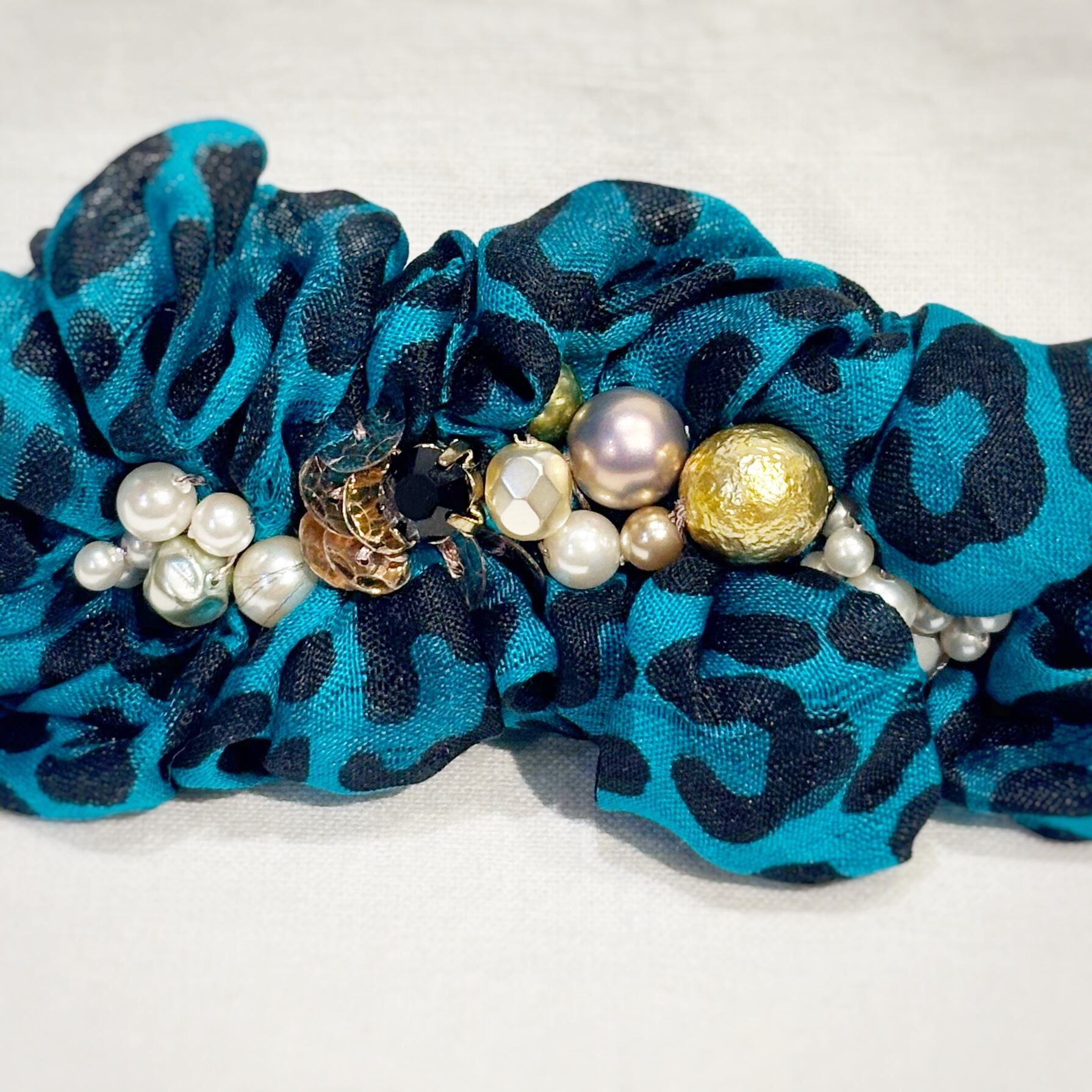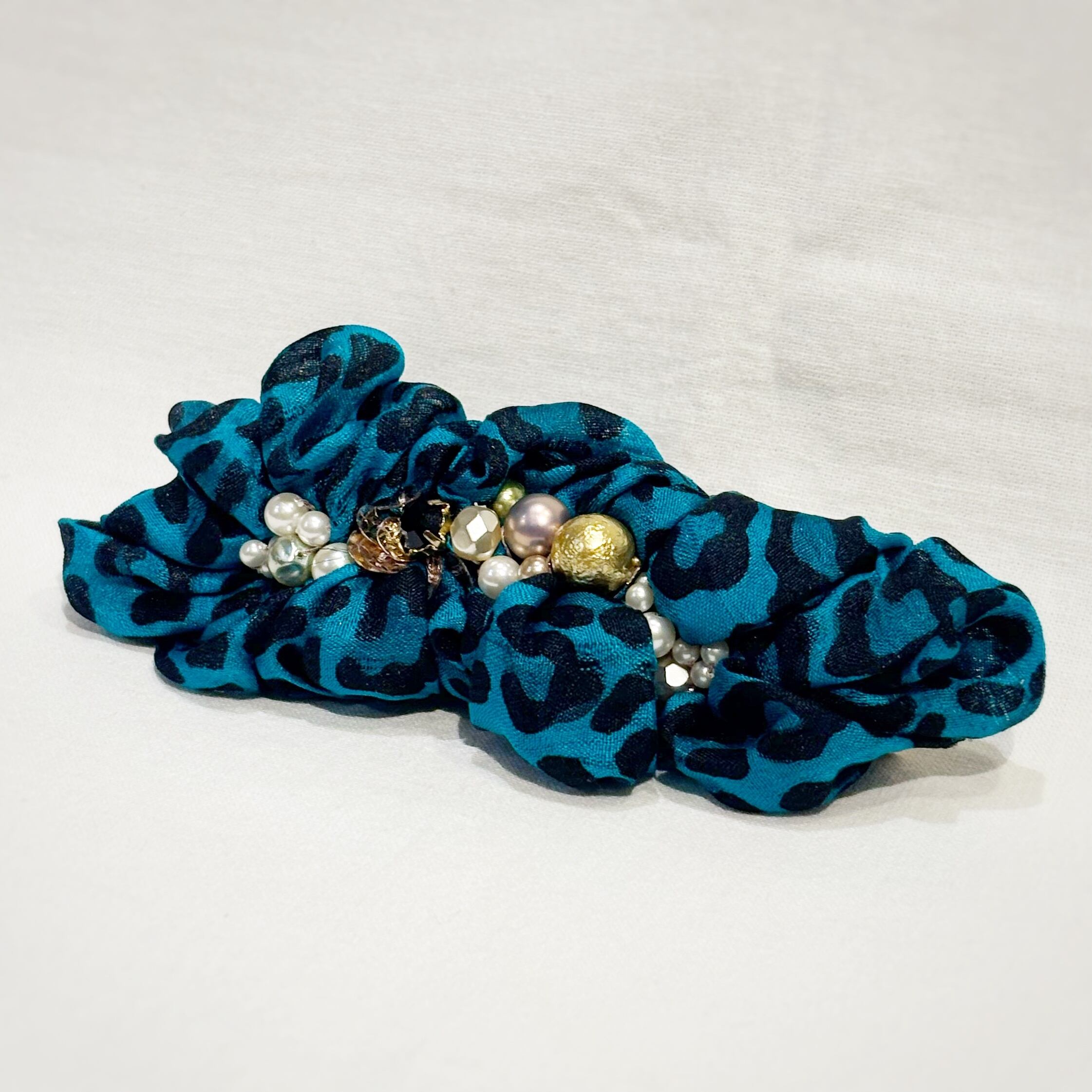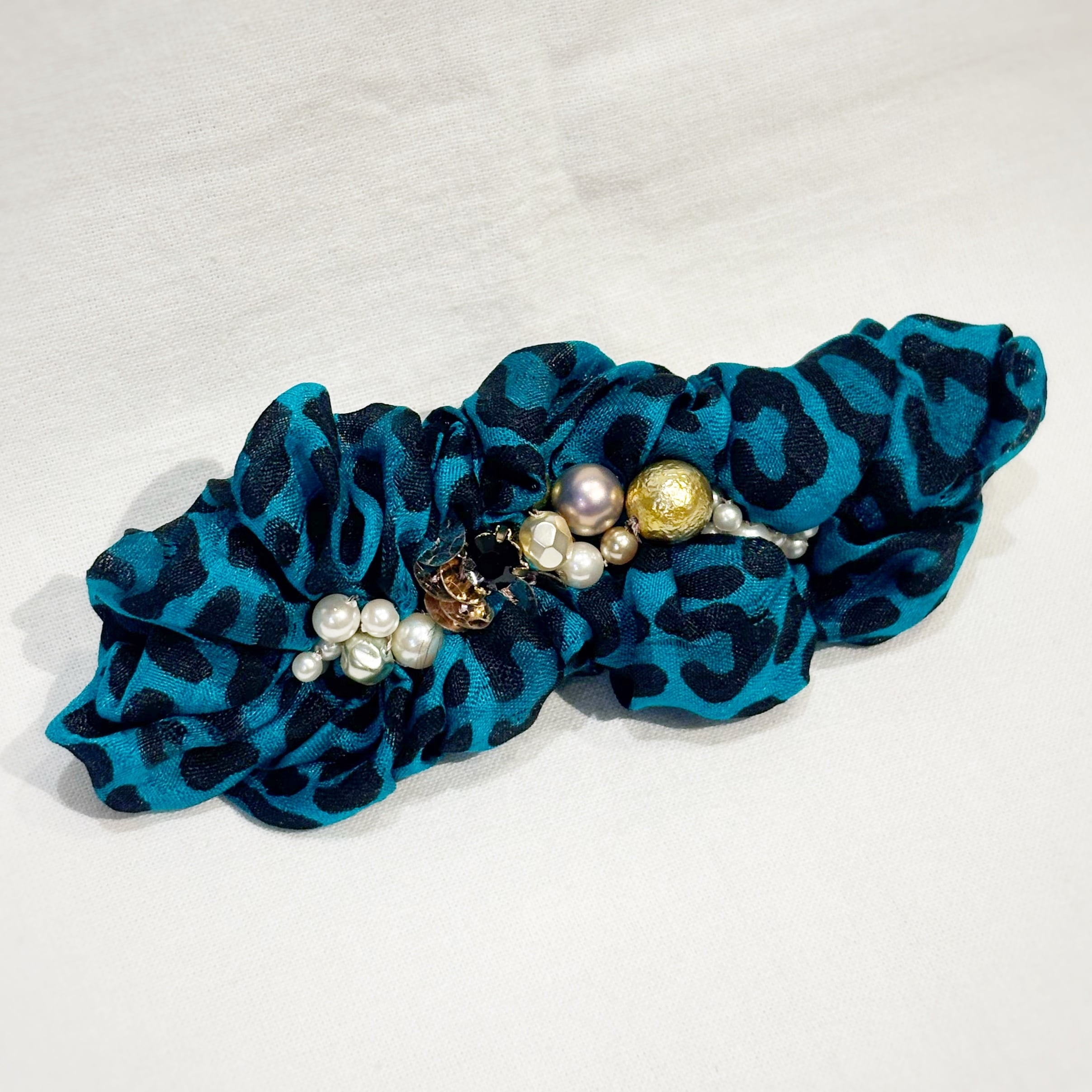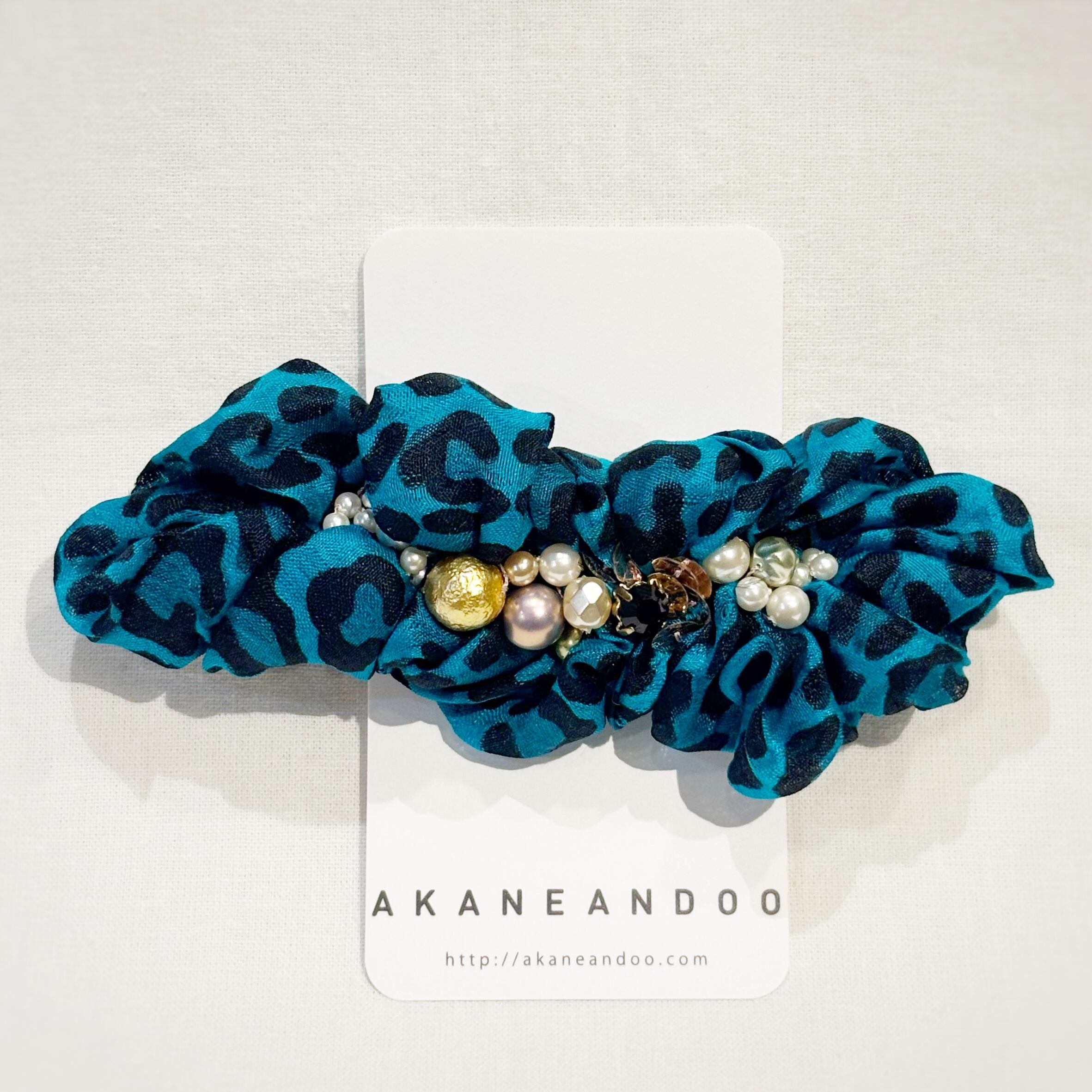 碧を基調とした神秘的なリボンは豹柄ですが色味やビーズのバランスがよく、上品な力強さに仕上がっています。