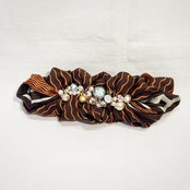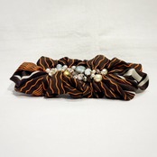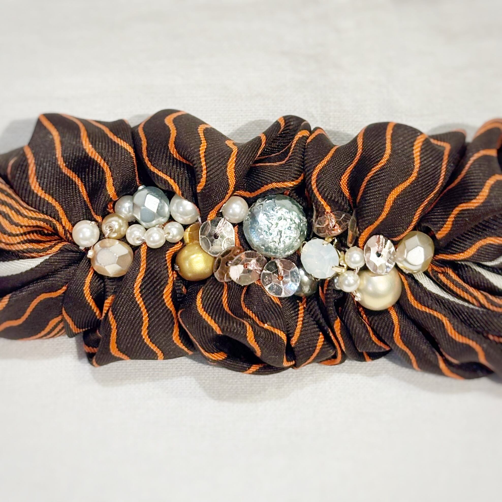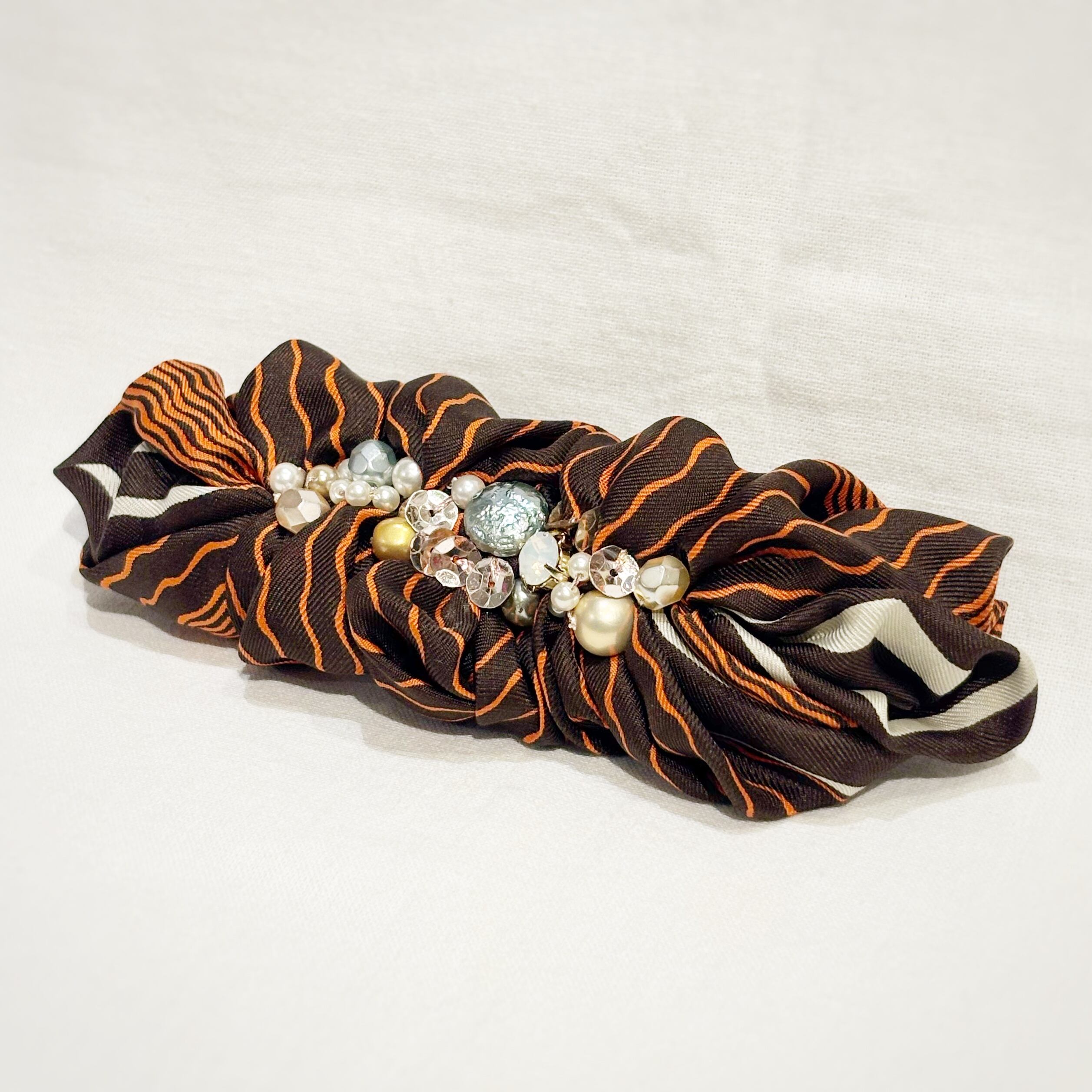 ブラウン・オレンジを基調としたリボンと華やかなビーズ、落ち着きのあるかっこよさが後ろ姿の印象をきりっと引き締めてくれます。