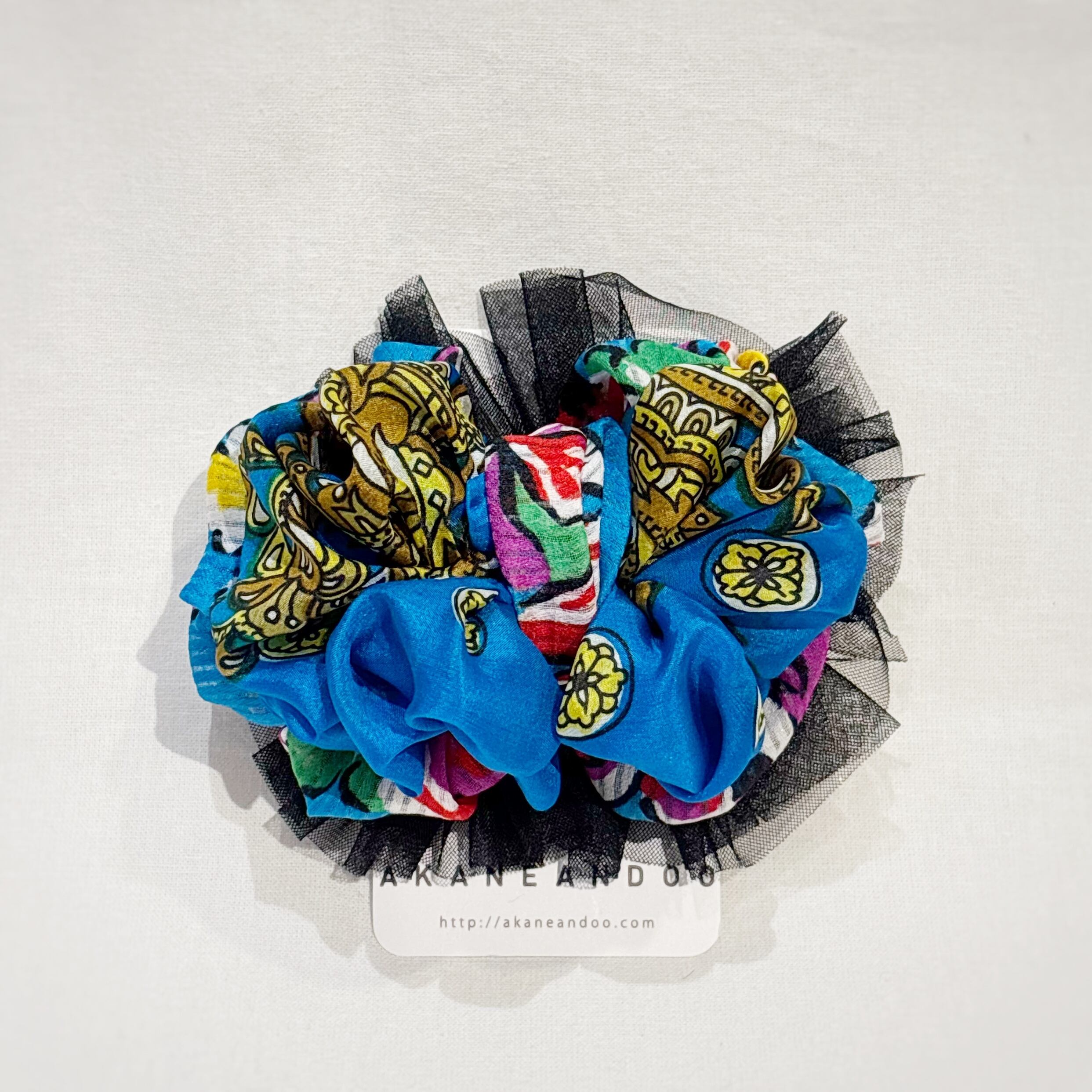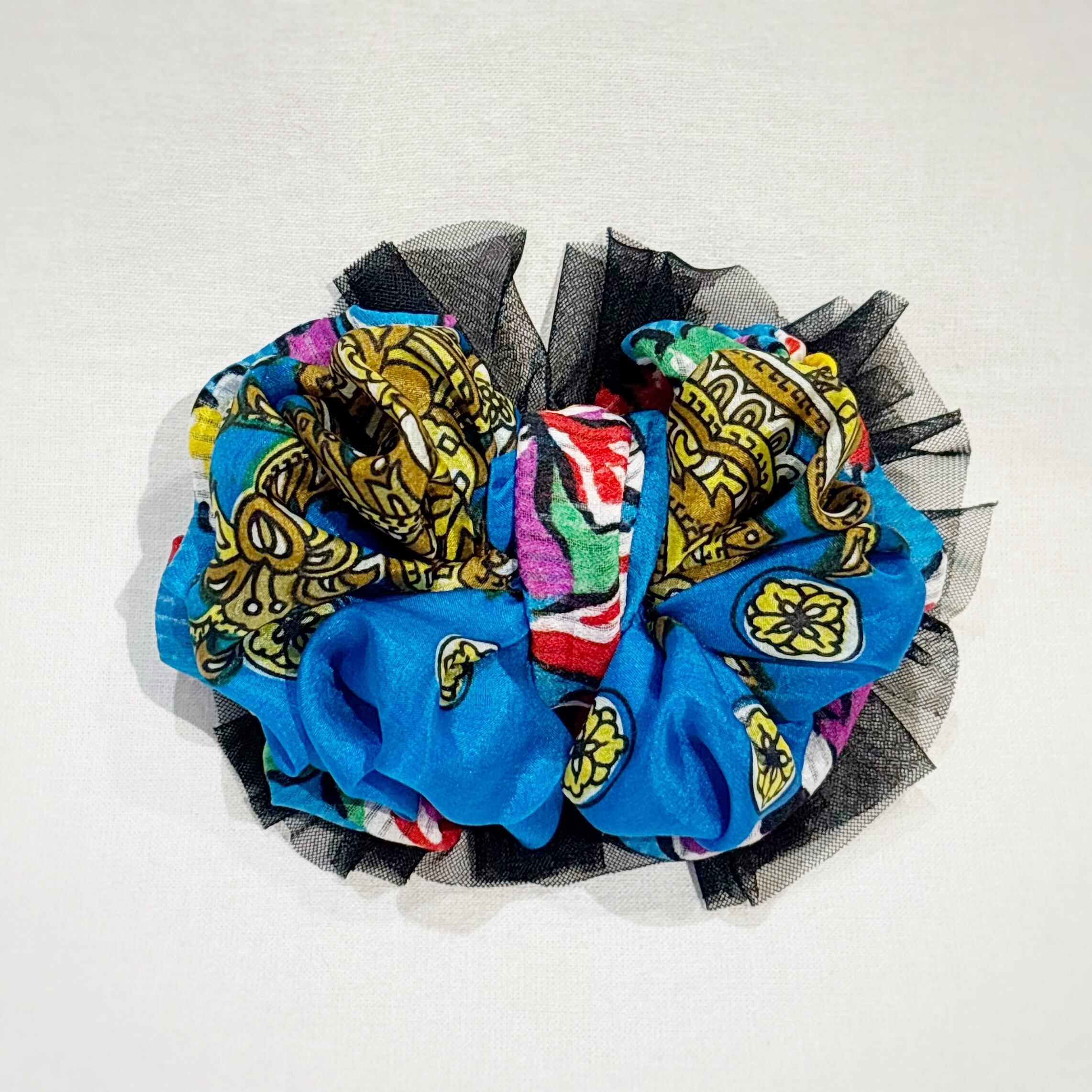紺青色のリボンと黒いレース、全体的にエスニックな印象がありつつも生地とレースの上品さによって落ち着きのある華やかなデザインとなっています。