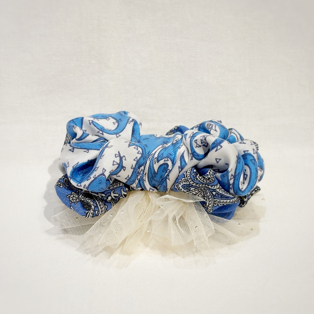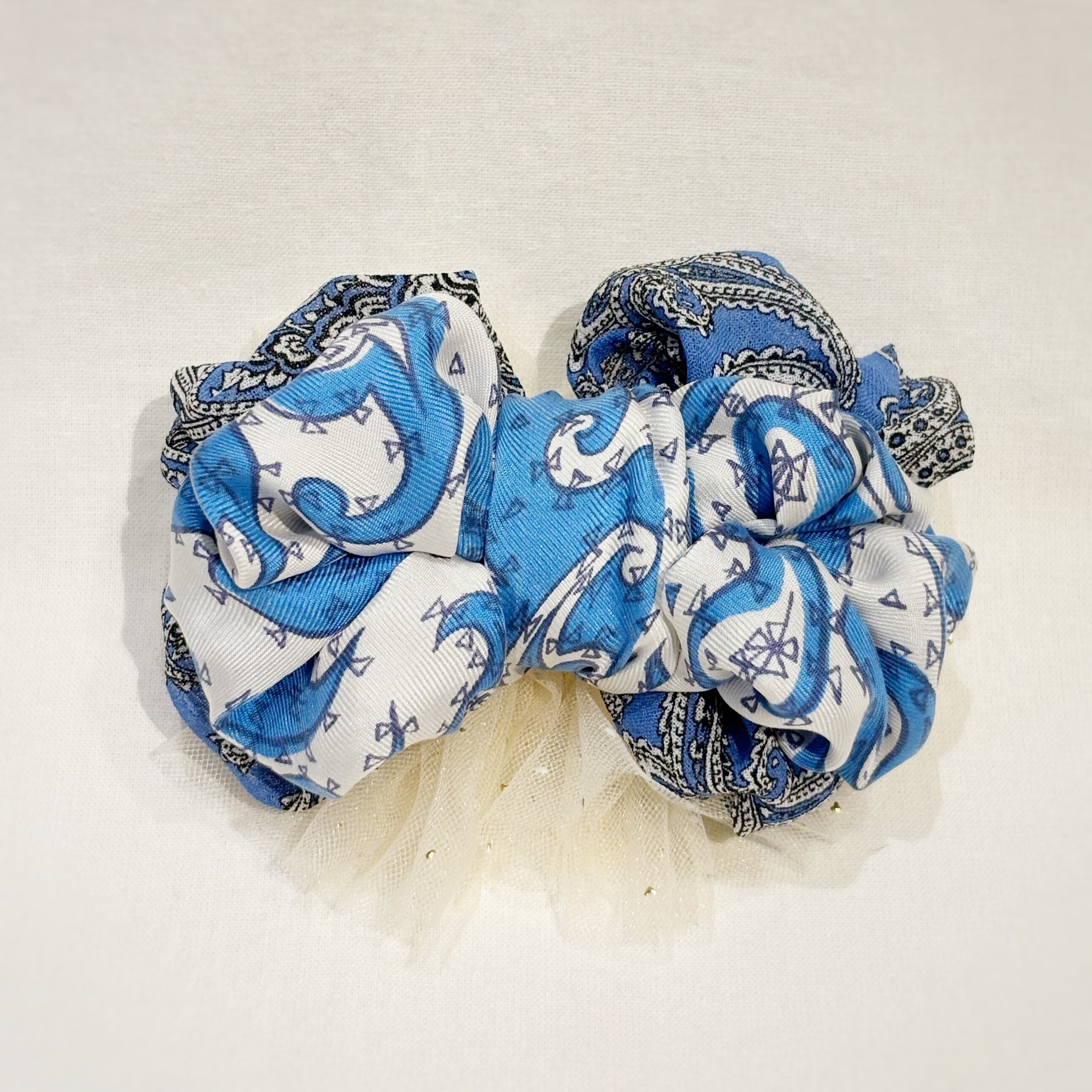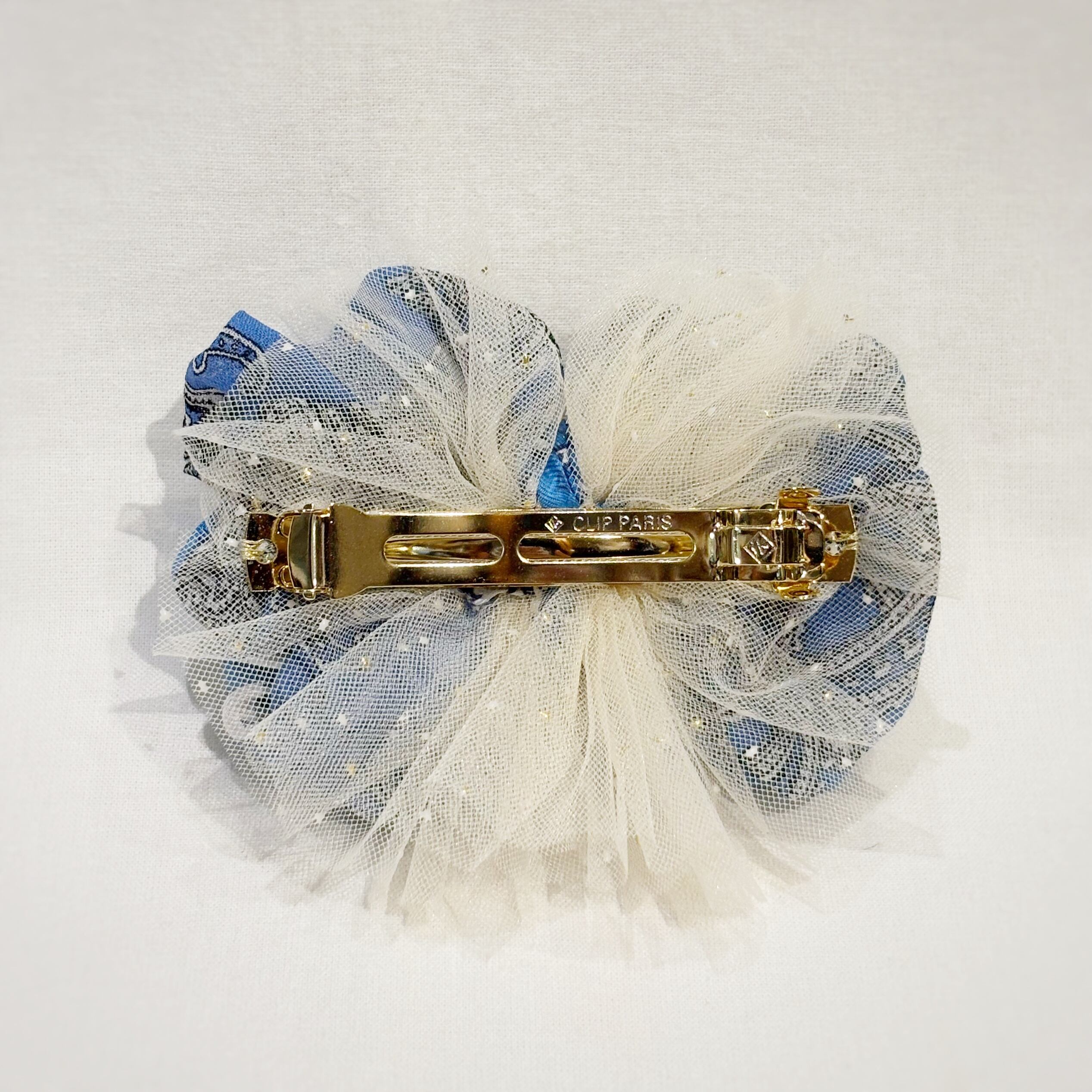 水色と白のリボンとちいさな金色の粒が散りばめられたレース、デザインと素材の組み合わせによりさわやかな印象に上品さが加わったリボンタイプのバレッタです。