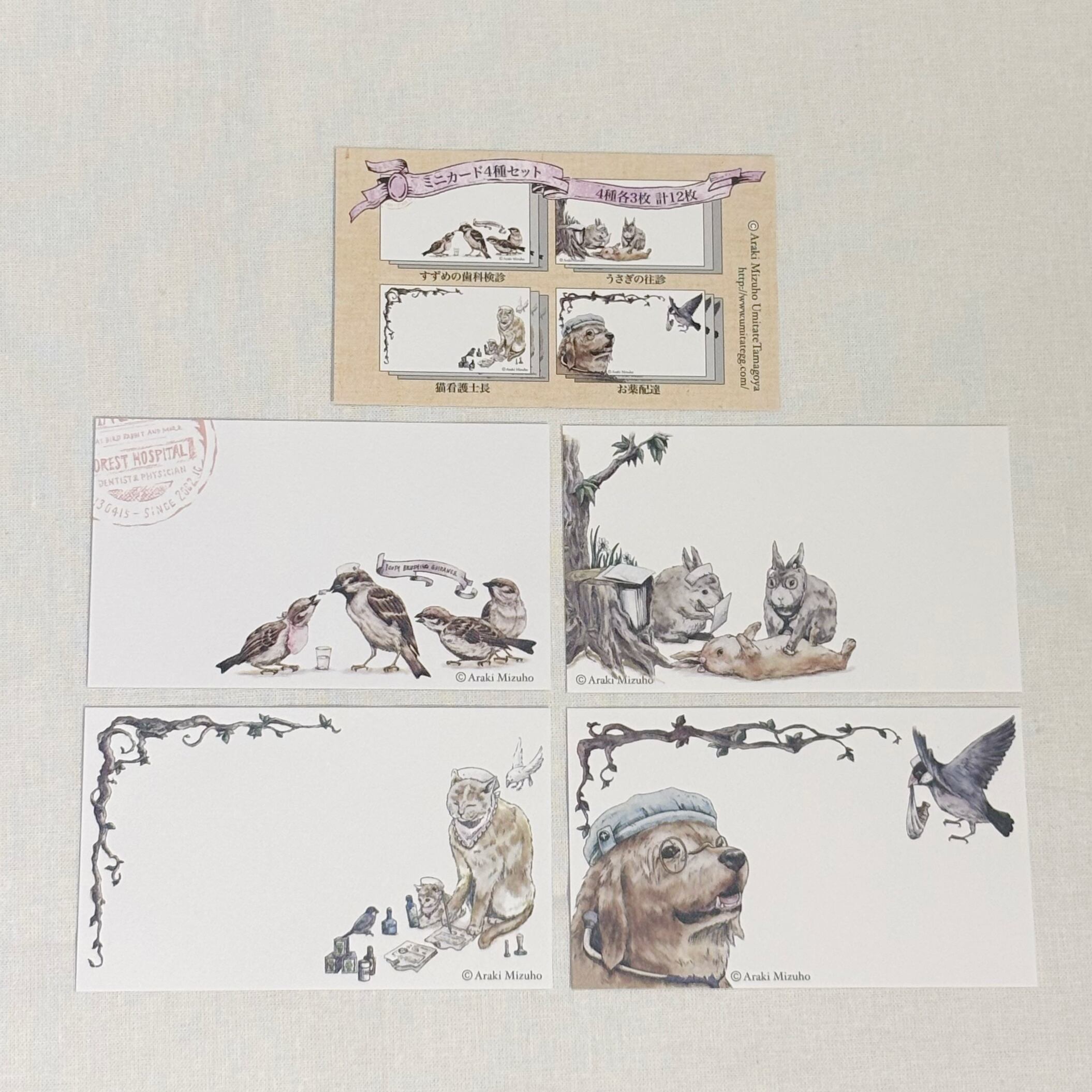 「すずめの歯科検診」「うさぎの往診」「猫看護師長」「お薬配達」の4デザイン
