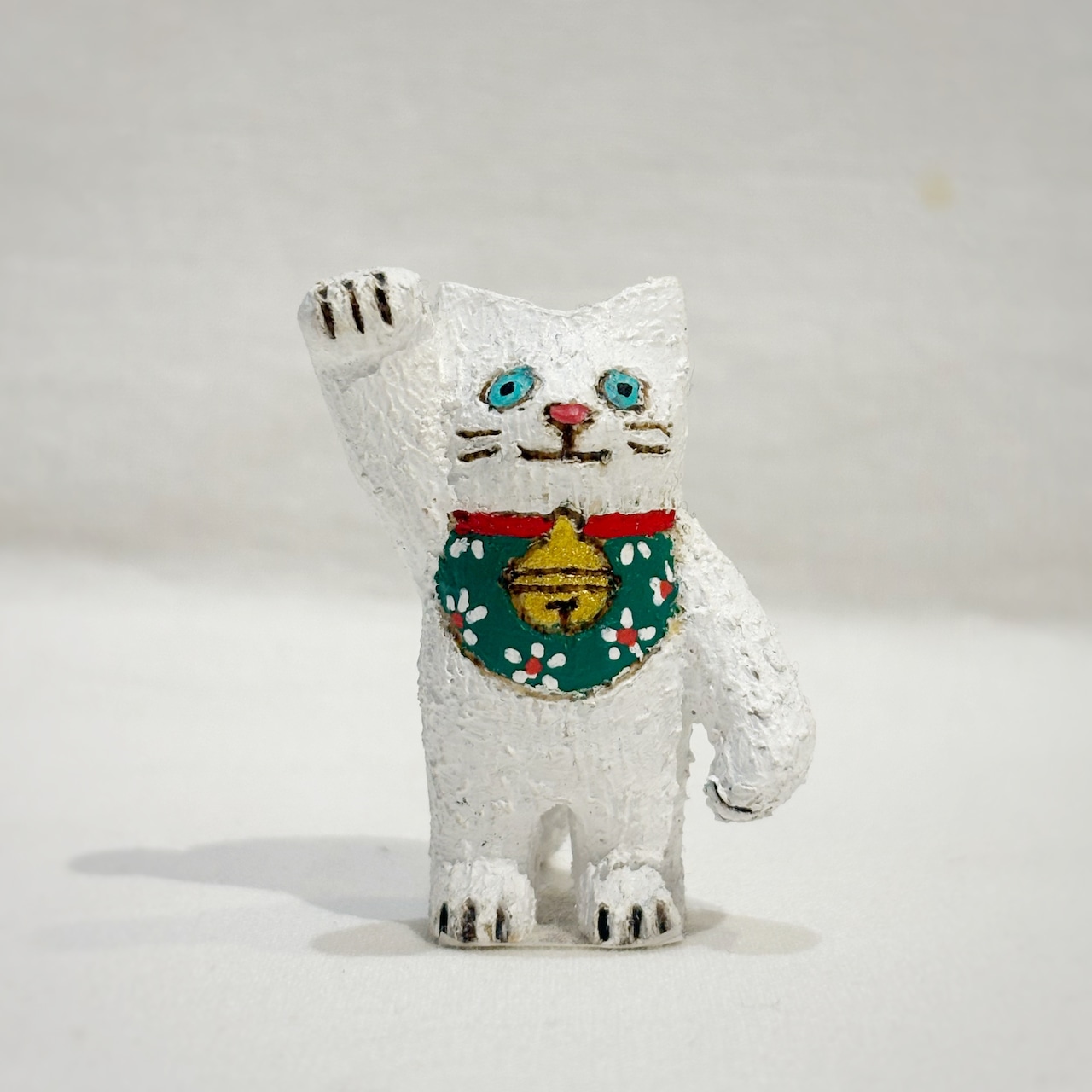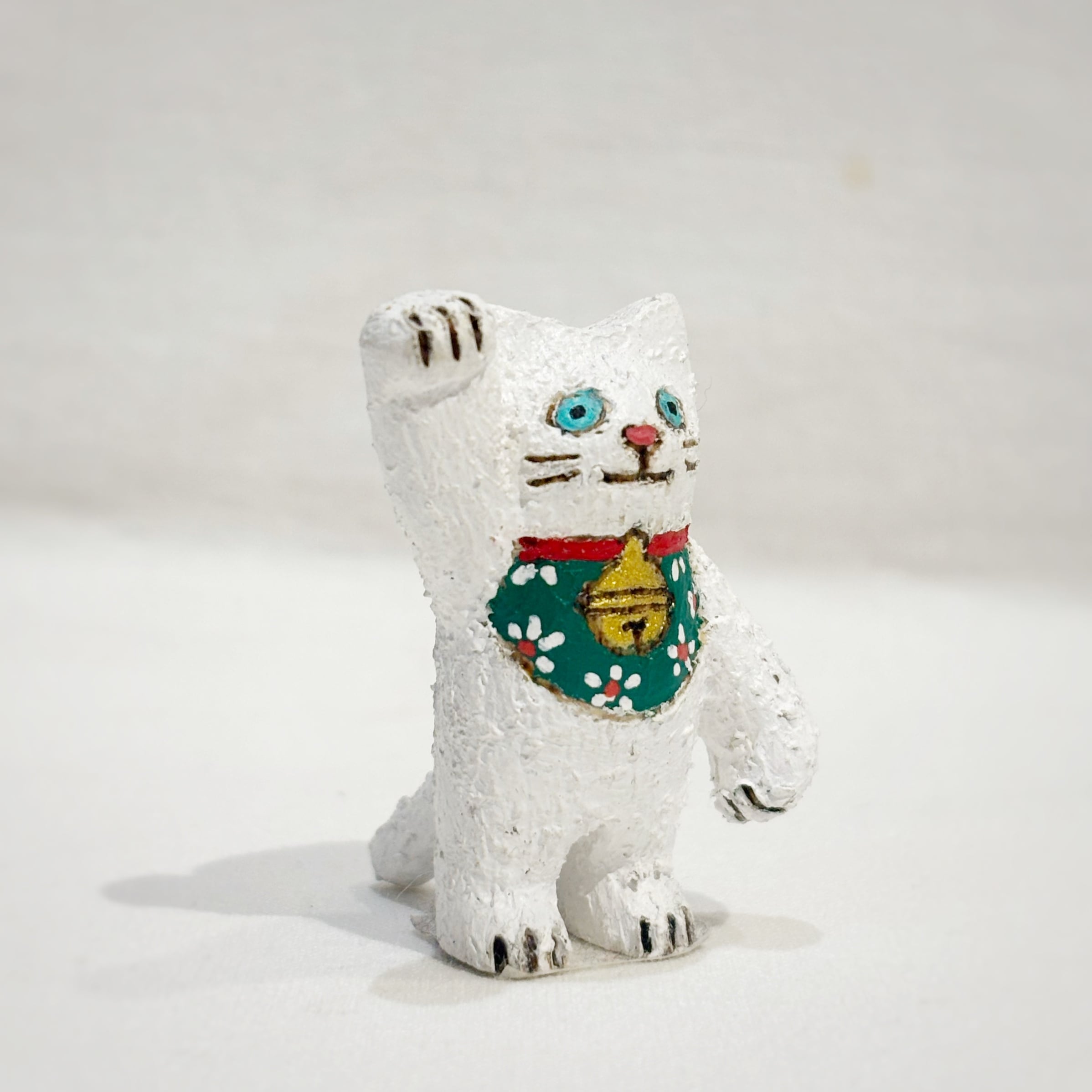 右手を高く上げる、緑に花柄のバンダナをした白いねこ。