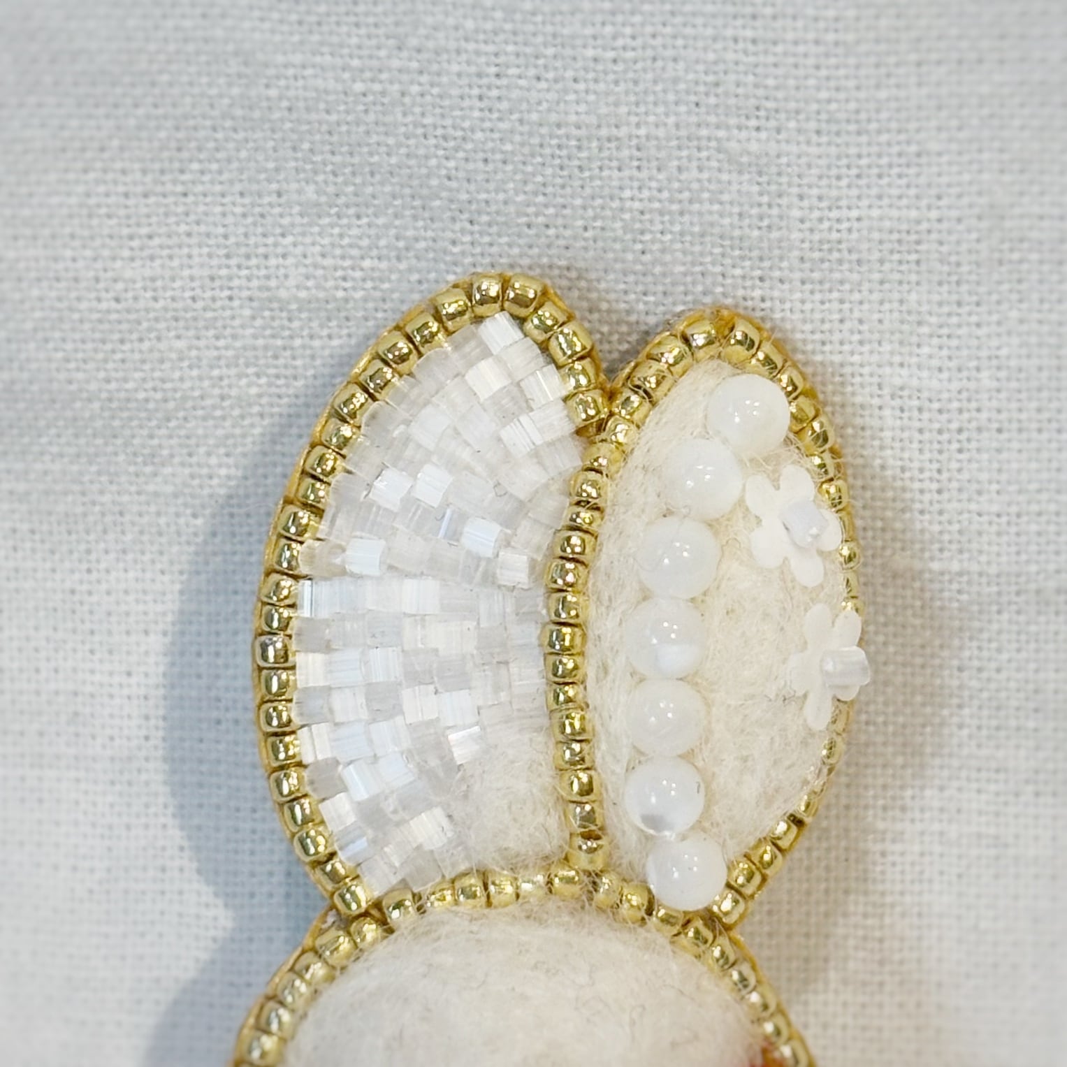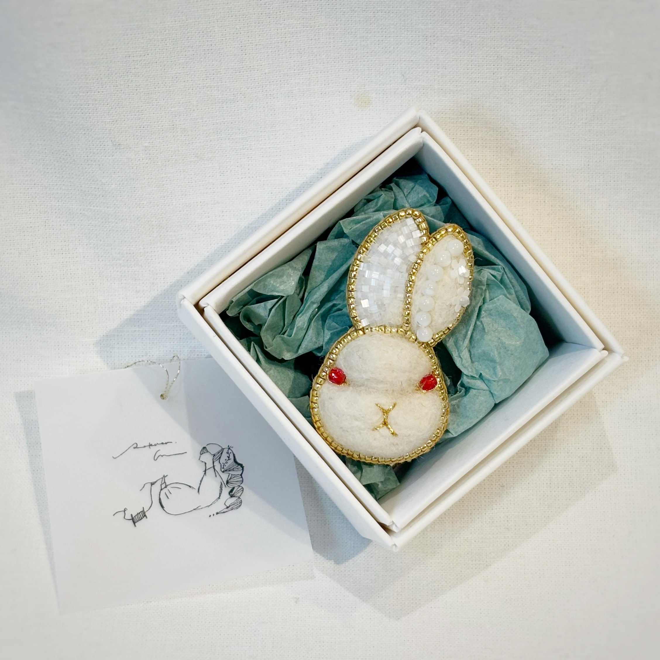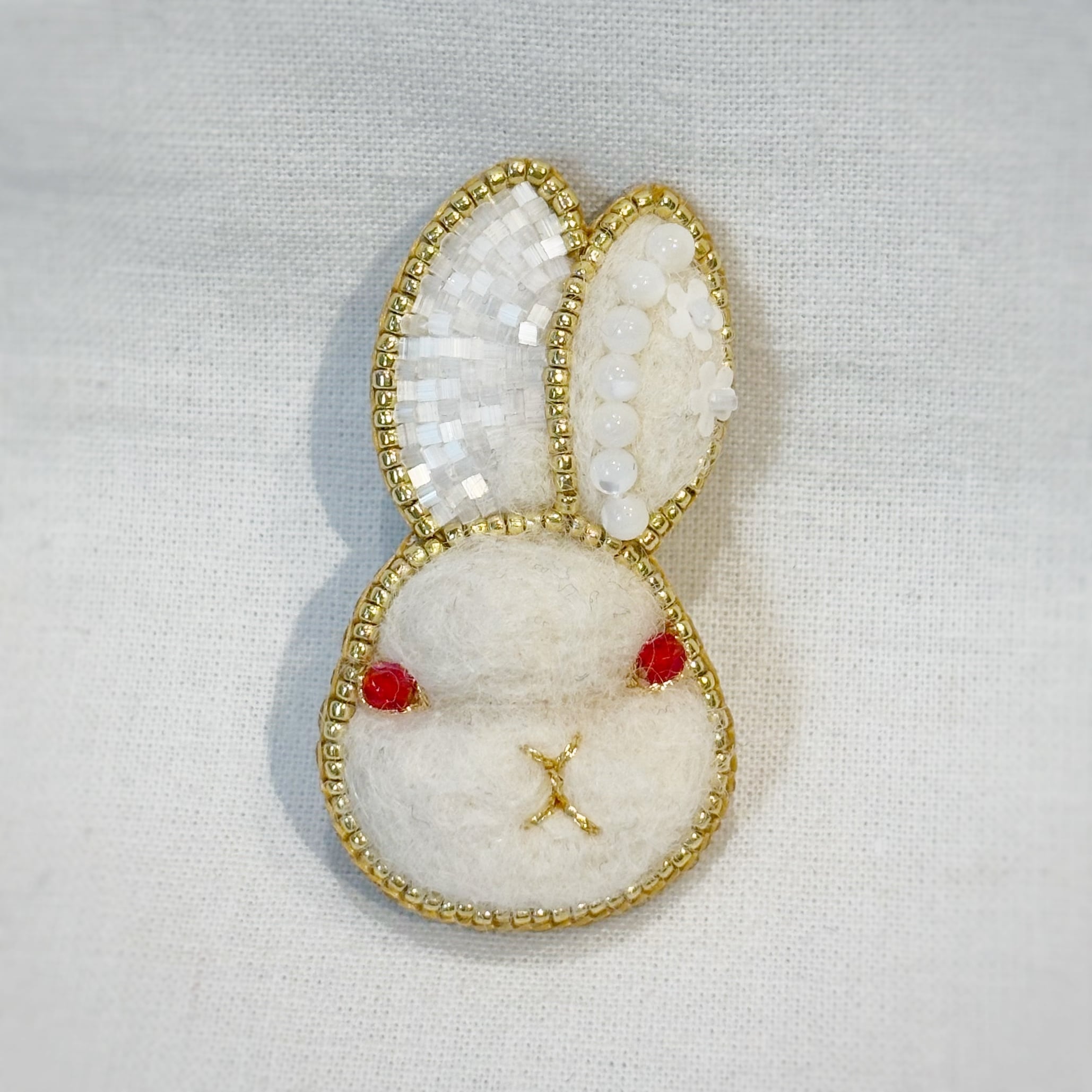 sakuraさんの作品で特に人気のあるうさぎシリーズより、真っ白なビーズをふんだんに使って制作したパーティの装いをした白うさぎのブローチです