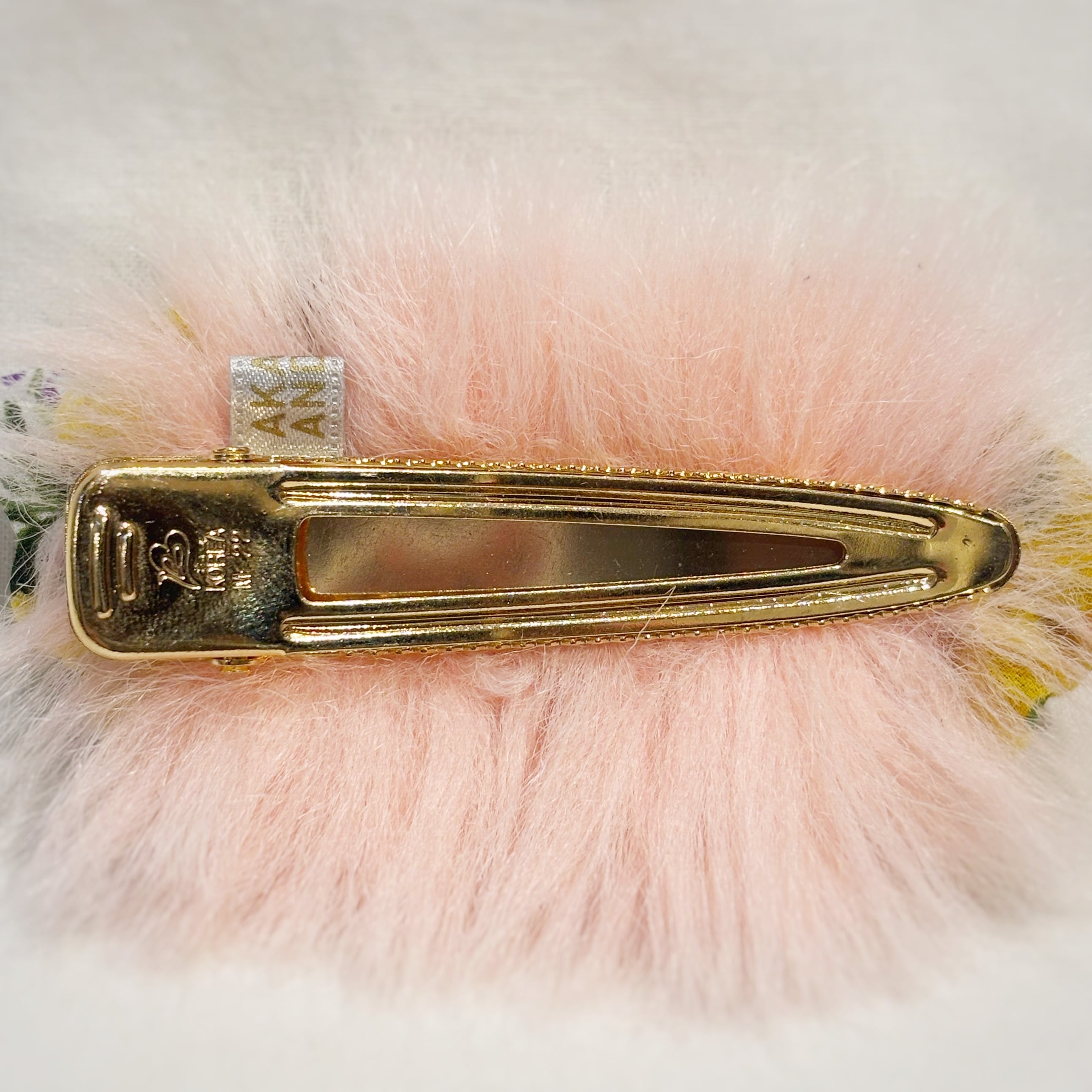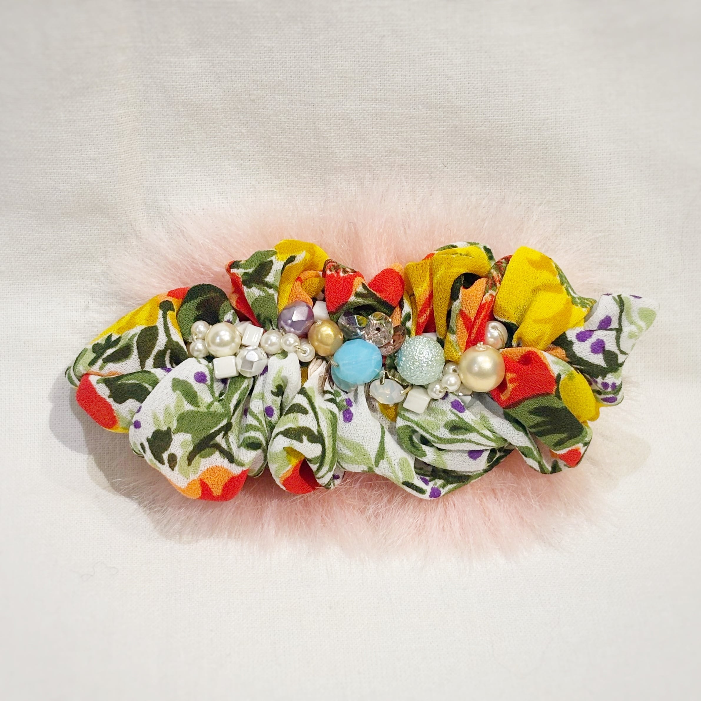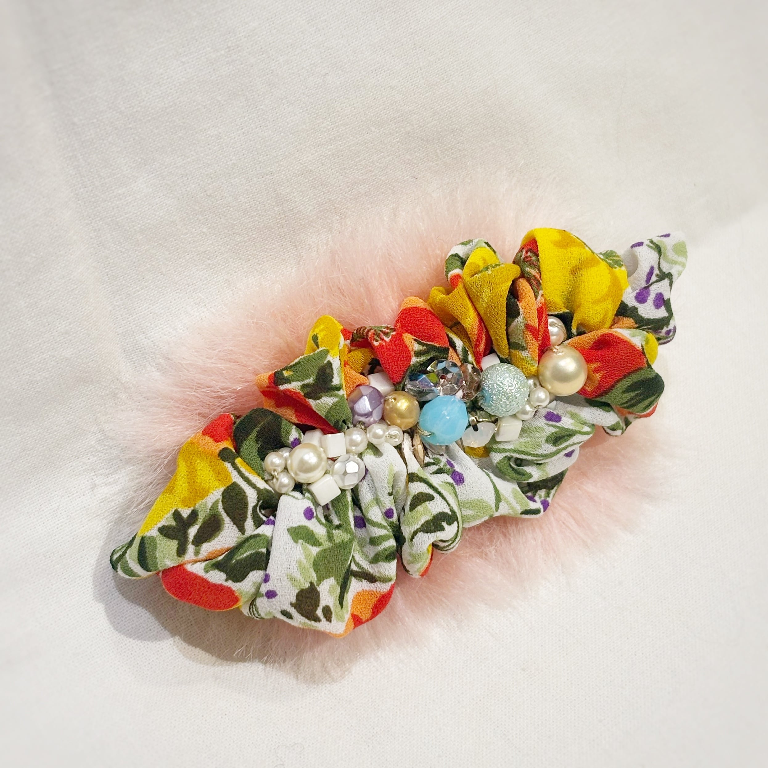 ボタニカルなデザインの生地をベースにビーズとファーを組み合わせ、全体にバランスのとれた華やかさのあるヘアクリップです。