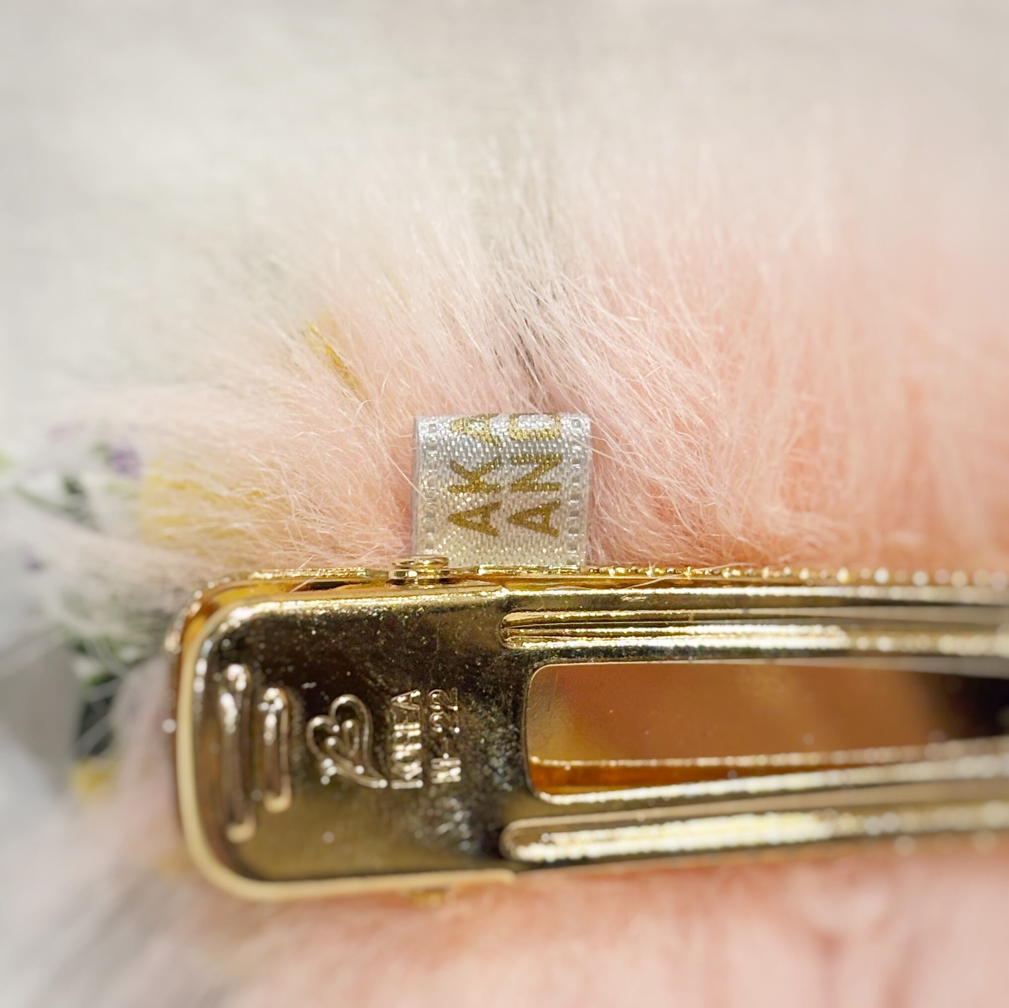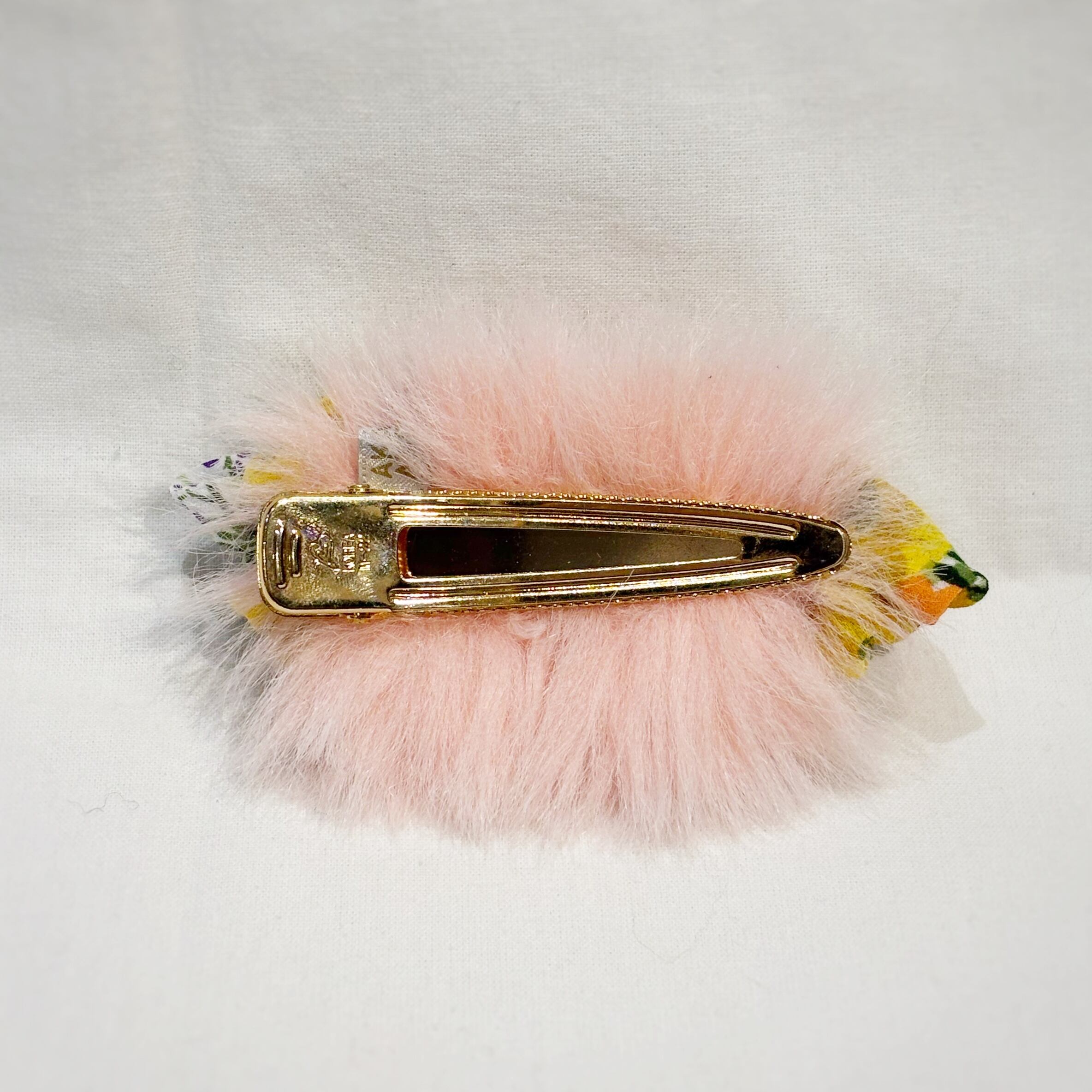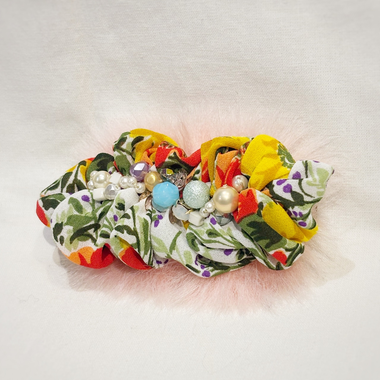 ボタニカルなデザインの生地をベースにビーズとファーを組み合わせ、全体にバランスのとれた華やかさのあるヘアクリップです。