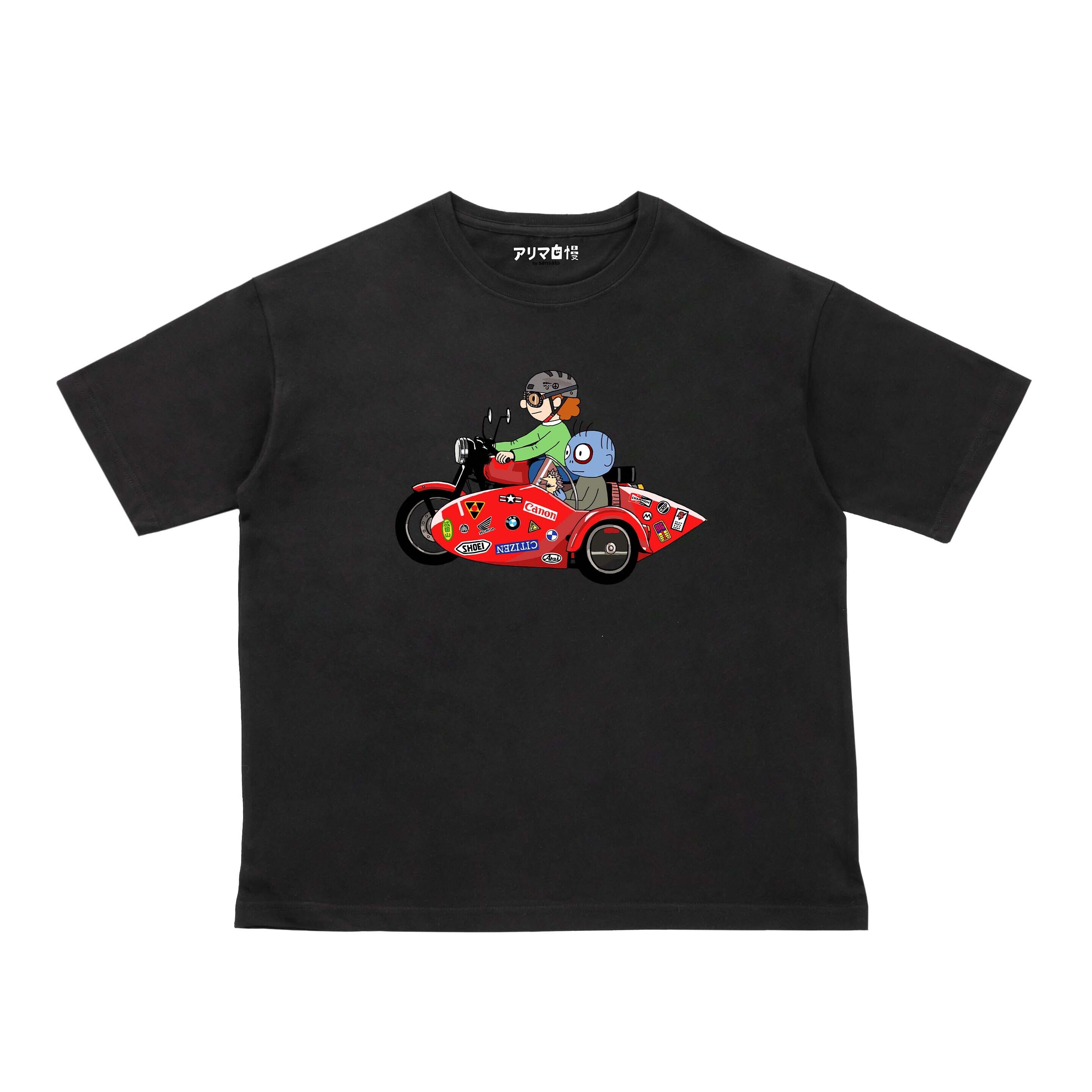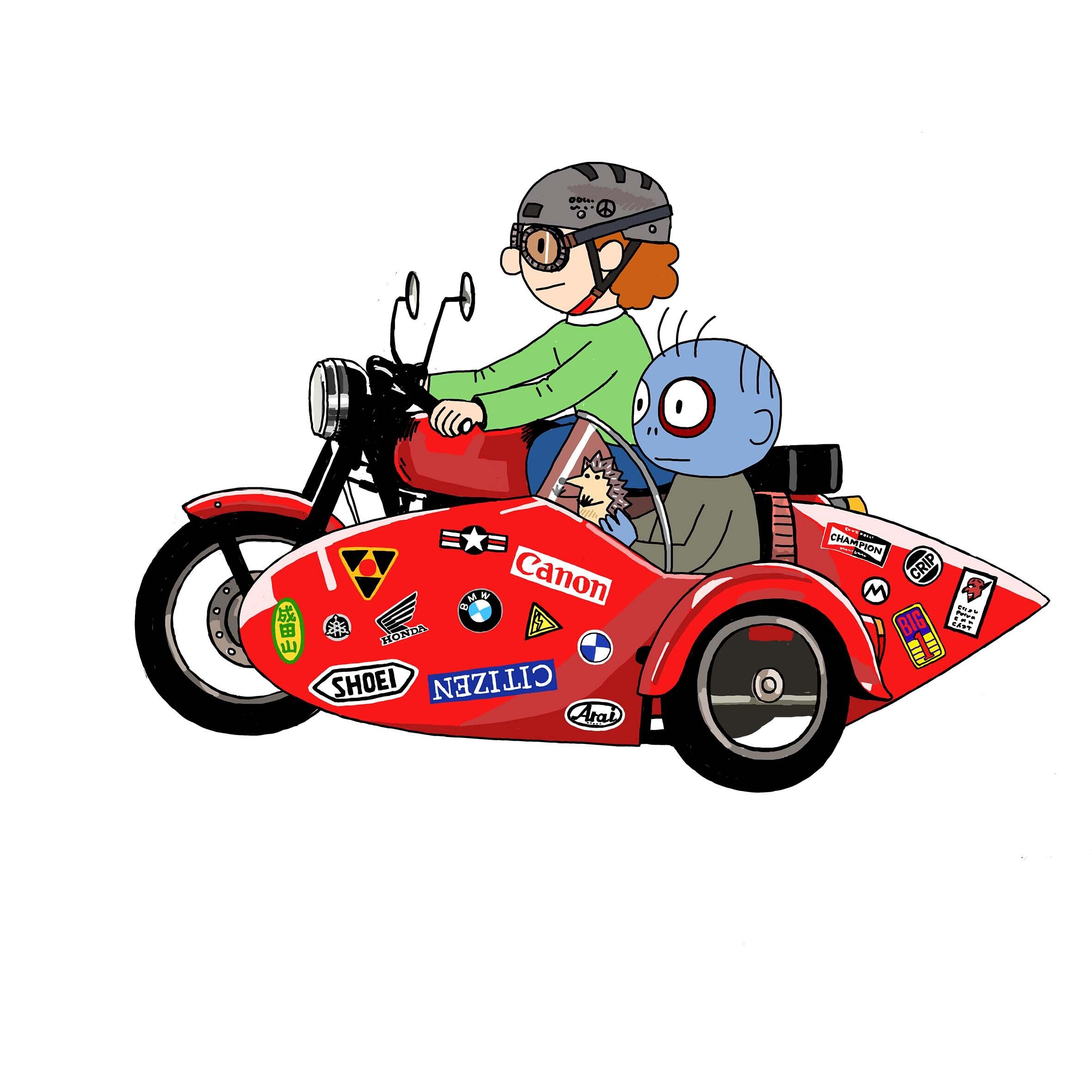 サイドカーで風に吹かれながらどこへ向かって走っているのか、想像をかき立てられる一枚です。たくさん貼られたステッカーがカッコいい!どこまでも走りたくなるTシャツでお出かけしませんか♪
