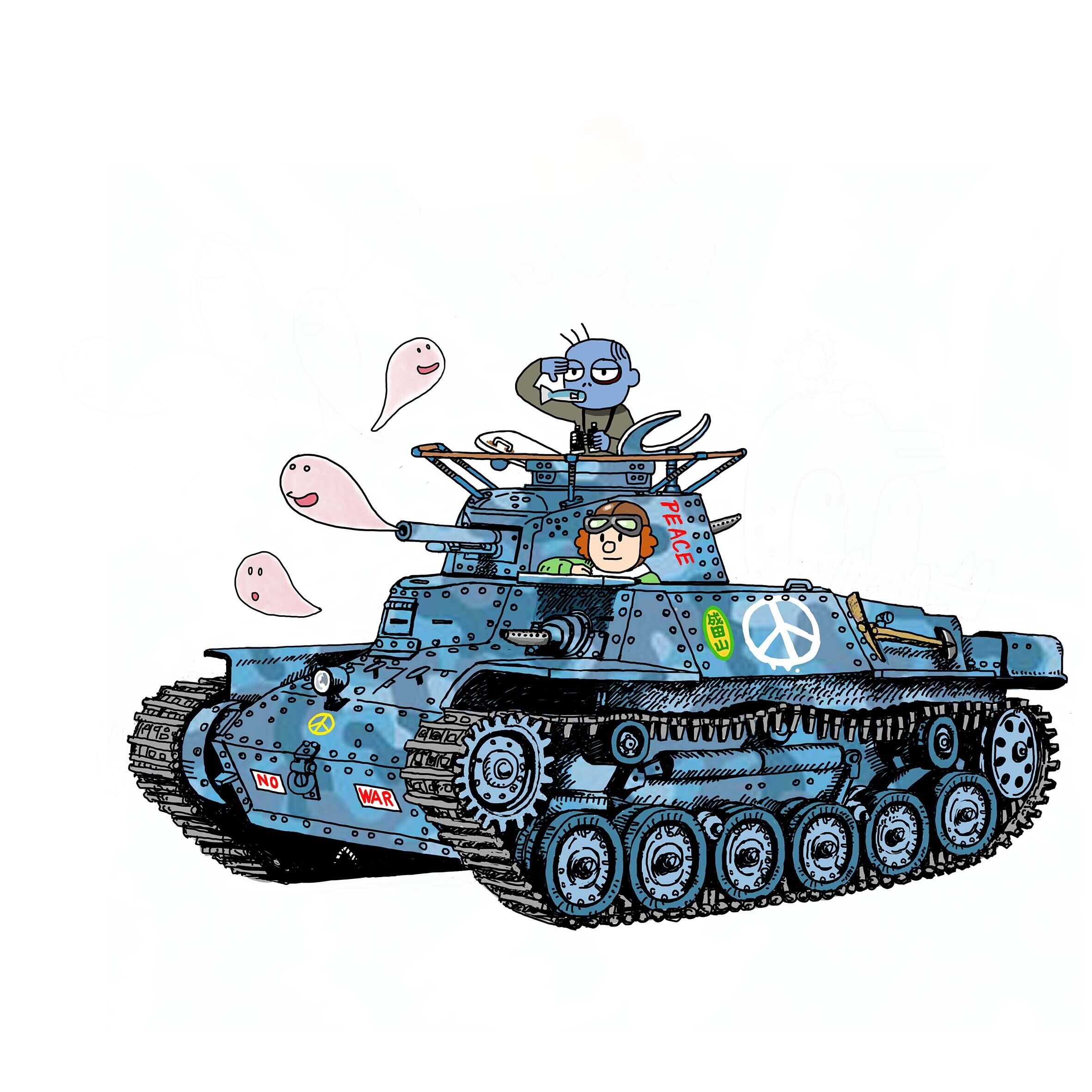 「PEACE」「NO WAR」と書かれたタンクに乗るゾンビくんはのんびりお散歩気分??広大なサバンナや南の島が浮かんできますね。キャタピラ部分の描き込みがカッコイー!タンク本体のさり気ない迷彩模様がファッショナブルな印象にしてくれる一枚です♪