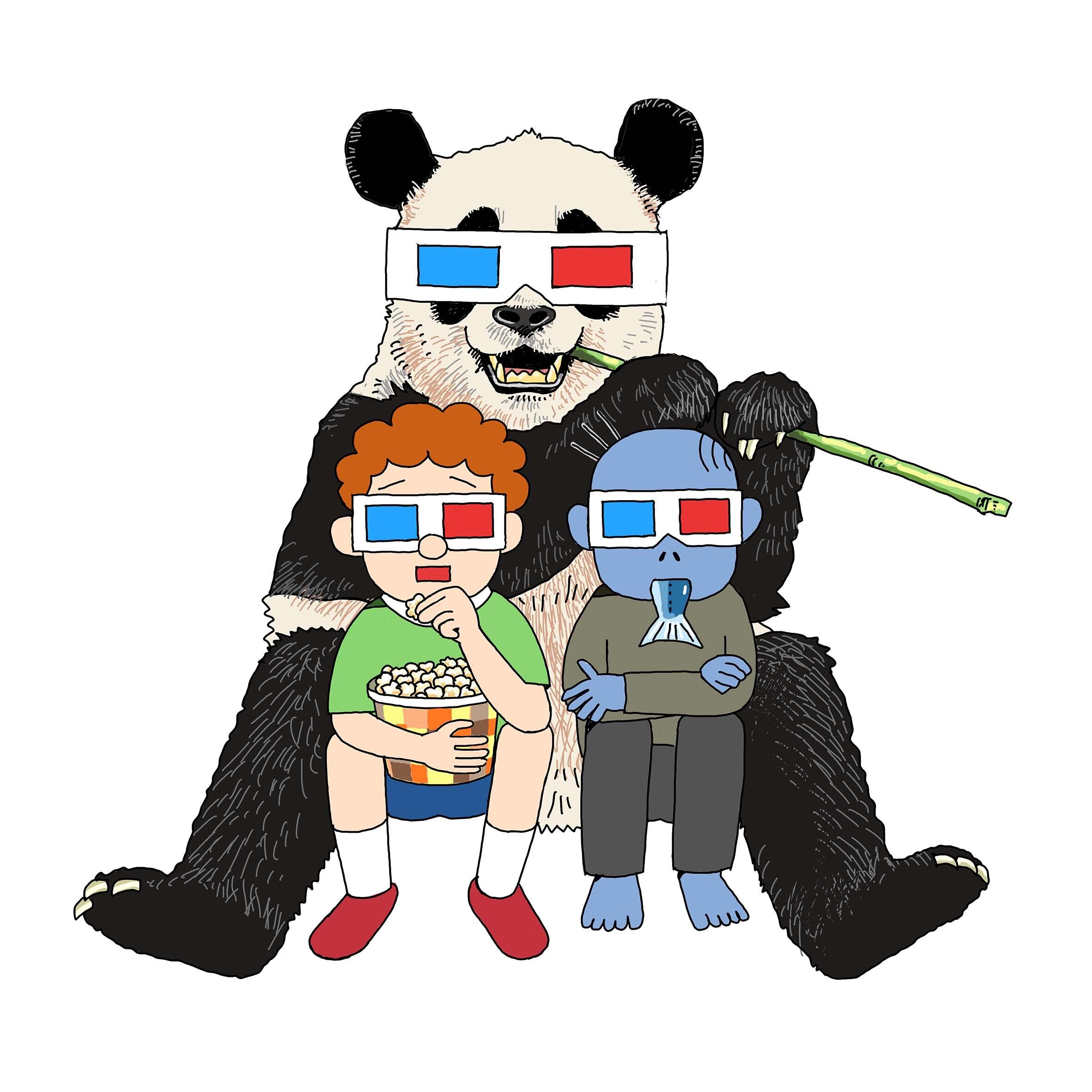 パンダと一緒にしたいことNo.1。3D映画を一緒に観ること。そんな夢の時間をイラストにしてくれました。よく見るとリアルなパンダと旧式の3Dメガネがレトロで可愛いです。これを着て映画館に行きたくなります!